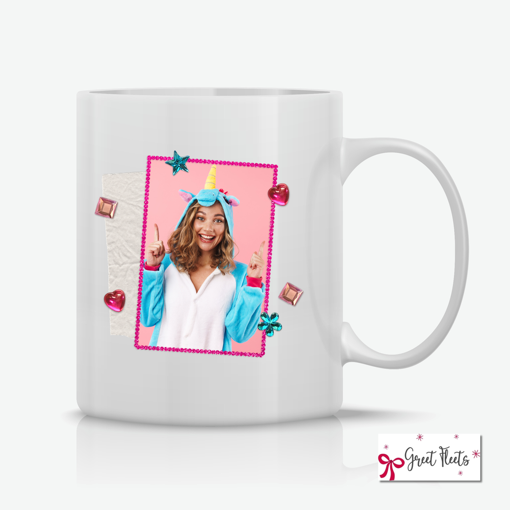 Create a super fun custom mug! Add your favorite picture to our sparkly pink frame design. Perfect unique birthday gift or best friend present from Greet Fleets.